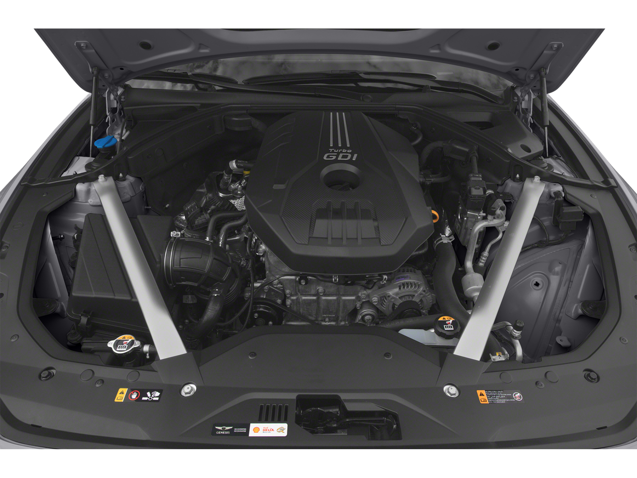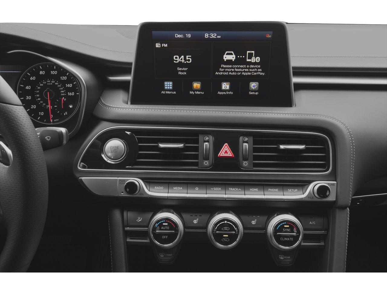 - Radio: AM/FM/SiriusXM/HD Audio System -inc: 6 channel internal amplifier, 6 speakers including subwoofer, 8" display audio, speed-sensing auto volume control, Apple CarPlay and Android Auto, Bluetooth® hands-free phone system, steering wheel audio, cruise and phone controls, 2 USB front: ( front console: data + charge / center console: charge only ), 1 USB rear (charge only), auxiliary input jack and Genesis Connected Services Telematics System